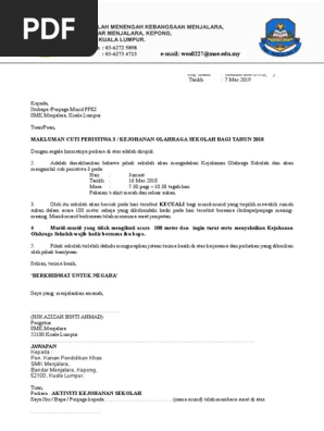 Savesave cuti peristiwa sempena hari sukan for later. 0 ratings0% found this document useful (0 votes). Oleh itu, besarlah harapan kami jika permohonan cuti ini dapat diluluskan. Jenis cuti karyawan ini disebut cuti tahunan yang diatur dalam pasal 79 dan 84 uuk nomor 13 tahun 2003. Hari sukan of smk taman setiawangsa 2019 thanks to everyone who made this video possible woooo.
