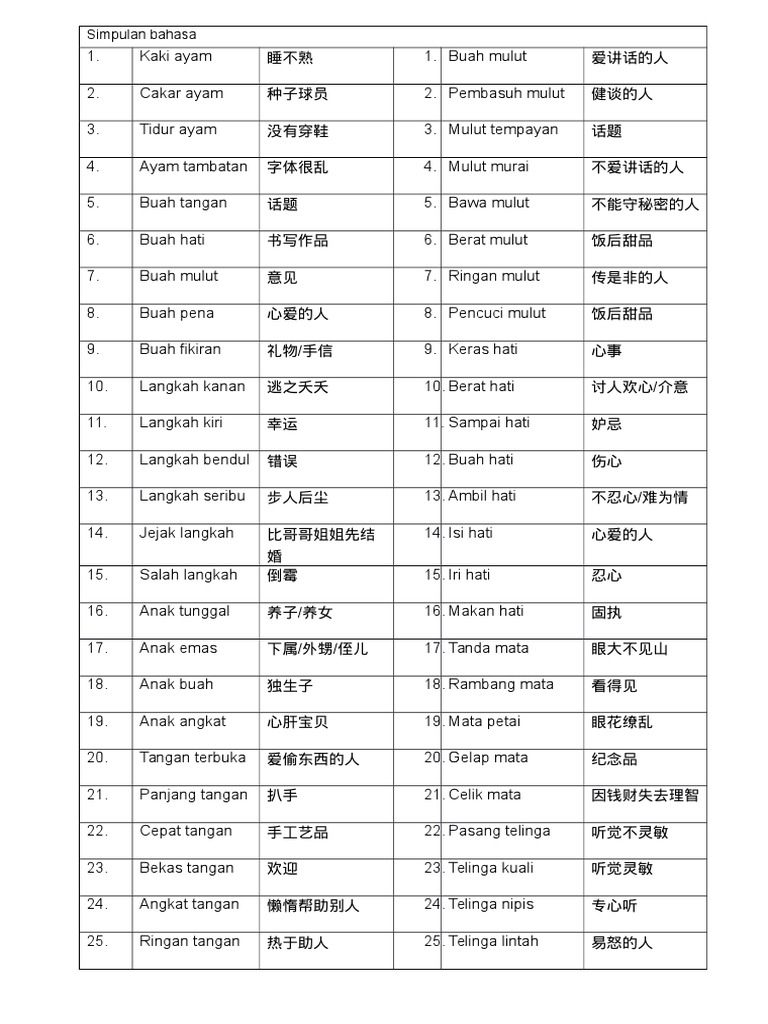 Orang yang menyebabkan pergaduhan antara dua pihak Pemuda itu menjadi anak angkat apabila dia tinggal bersama keluarga kami sejak lima tahun lalu. Hamidah mempunyai seorang abang angkat bernama hamzah. Peribahasa adalah salah satu aspek penting di dalam pembinaan karangan bahasa melayu. (b) pengsan kerana terlalu banyak mengeluarkan darah. (sila lihat juga hati waja.) keras kepala: Senarai simpulan bahasa beserta dengan maksudnya adalah seperti yang berikut: Simpulan bahasa yang berlainan tetapi mempunyai maksud yang sama.contohnya seseorang yang tidak mempunyai malu muka talam ,muka tebal ,muka tembok Orang berpangkat yang telah diturunkan pangkatnya. Biasanya simpulan bahasa terdiri daripada dua patah kata. Seseorang lelaki yang lebih tua daripada kita yang mempunyai pertalian darah dengannya tetapi telah sanggup sebagai anak oleh ibu bapanya. Sekarang kita akan belajar simpulan bahasa komik bergambar. Simpulan bahasa ialah susunan dua perkataan dalam bahasa melayu yang amat tersusun dan bermakna.